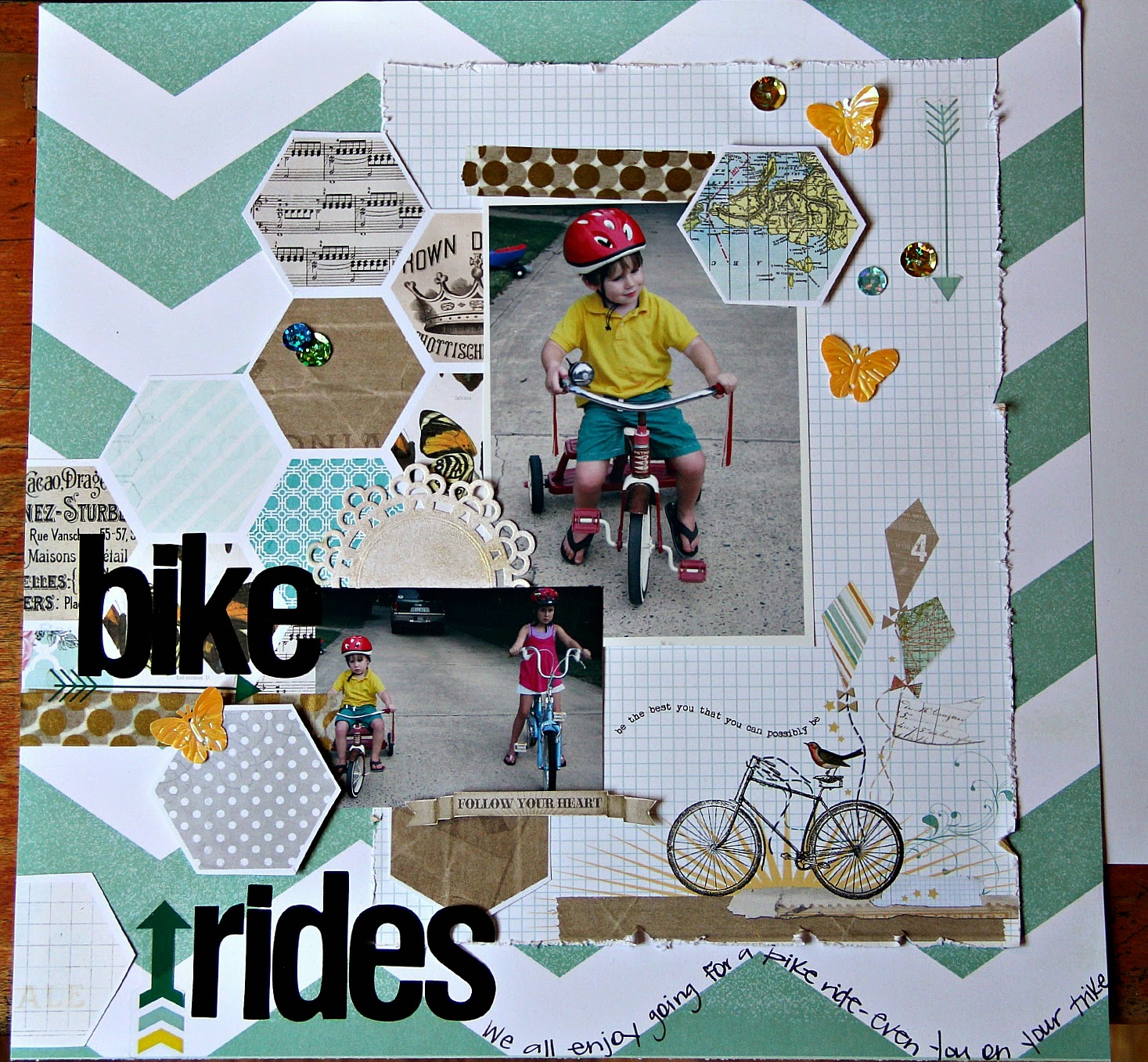 I started with the chevron paper from the Cut & Paste collection. I then layered the graph paper and the hexagon paper (Follow Your Heart) on top of that. This was one of my all time favorite MME collections!!